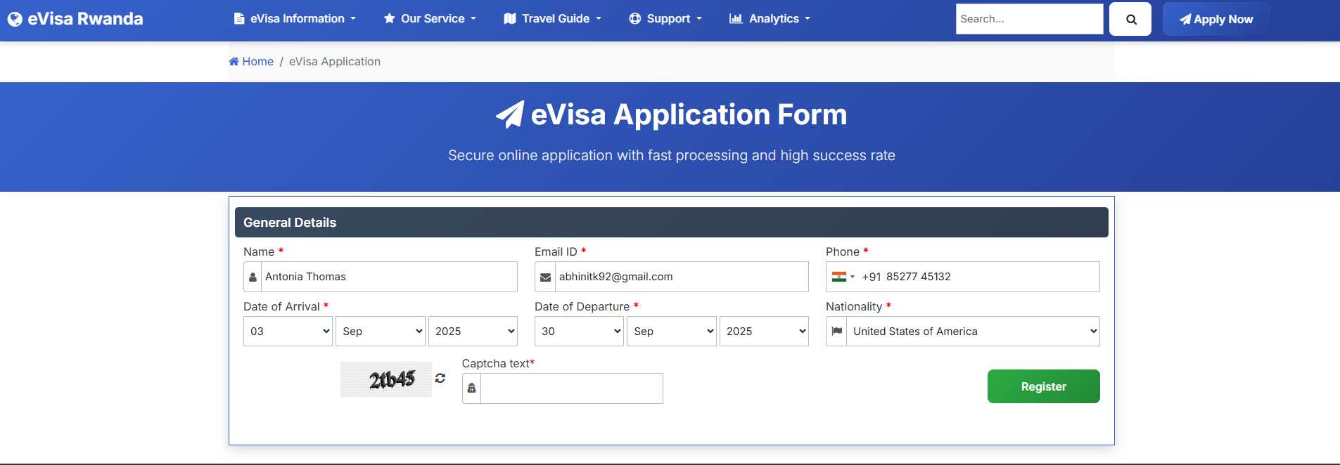 The Rwanda e-Visa application form Enter your personal information, passport details, and travel dates on the online form.